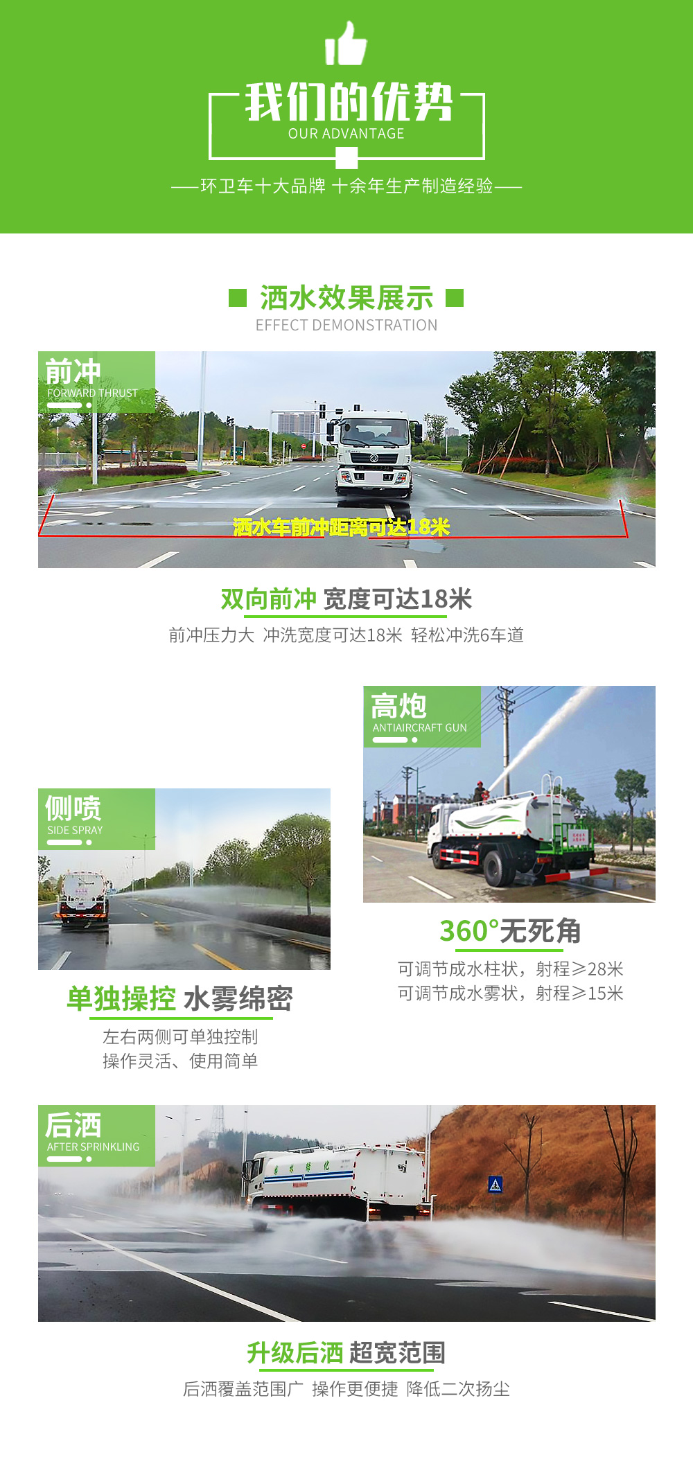 專用功能配置:罐體實(shí)際容積約為2.7立方米,公告有效參數(shù)2.18立方米、采用武鋼優(yōu)質(zhì)碳鋼板卷壓成型。配備專用灑水泵,自吸自排,前噴后灑、后對(duì)沖、側(cè)噴、后工作平臺(tái)及灑水高壓炮。灑水泵自吸高度為6米左右,整車灑水寬度14米左右,后工作平臺(tái)水炮可調(diào)成:直沖狀、大雨、中雨、小雨、霧狀、有效射程≥28米,整車帶接頭、水位計(jì),自流閥及自吸功能。后平臺(tái)主管道有一個(gè)一寸的澆花接口,附送2根3米水管,1個(gè)爬梯,兩側(cè)及后保險(xiǎn)杠。