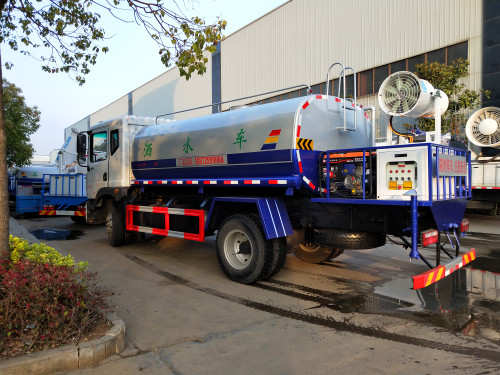 東風(fēng)D9多利卡抑塵車,帶自吸泵自吸自排,可將池塘的水直接吸入罐體內(nèi)也可直接從城市街道消防栓上連接注水,吸入罐體內(nèi)。罐前量水位管、罐后爬梯、罐上罐口帶簡易護欄、罐側(cè)雙炮筒、4寸鋼絲塑膠管兩根,罐體表面雙層油漆工藝,防銹、耐腐蝕?砂惭b50-80型柴油霧炮機組柴油電機組,發(fā)電機內(nèi)置安裝。
