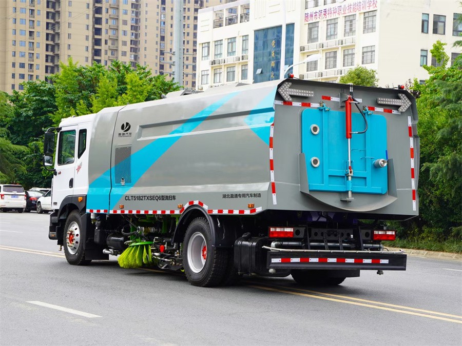 東風(fēng)18噸清掃車產(chǎn)品特點 1.集掃路車和高壓清洗車功能與一體,實現(xiàn)在一次作業(yè)中完成清掃、高壓清洗 和垃圾、污水的 收集。所有功能(全洗掃、全清洗、全掃、左洗掃、右洗掃、 左掃、右掃、左洗、右洗等)可 單獨控制,也可聯(lián)動控制。 2.車輛配有冷暖空調(diào),液壓方向助力,右影像、倒車影像,工作音樂喇叭