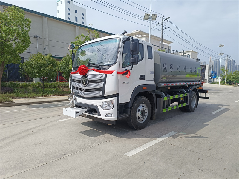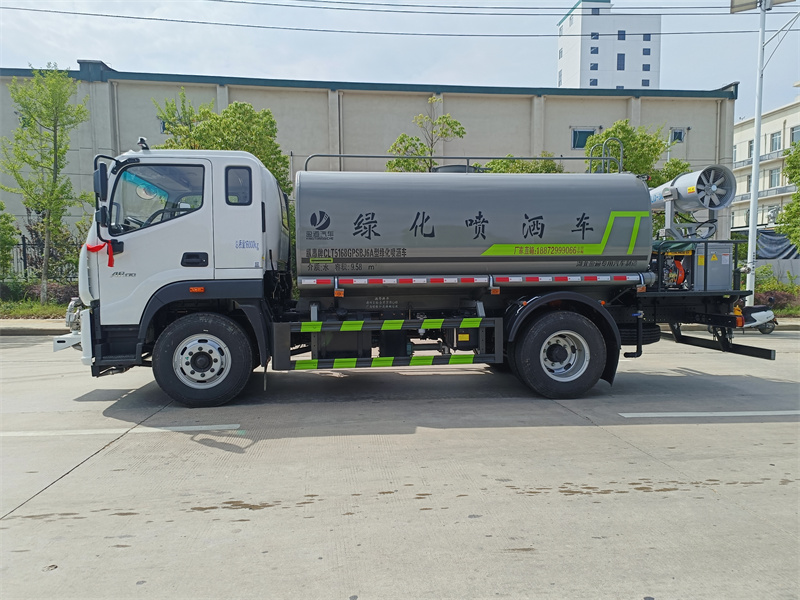 產品簡述:縱昂牌 CLT5188GPSEQ6A 型綠化噴灑車標配前噴(鴨嘴)、后對沖、 后灑、側噴、后置式工作平臺,平臺上配置綠化水炮(可 360°旋轉,既可以調 成柱狀,也可以調成霧狀),配備優質大功率專用灑水泵(可自吸自排,可從河 里或池塘抽水到罐體),取力器,雜物過濾網,消防接口,自流球閥系統、取力 器、球閥、濾網均為國家標準產品,主管道加粗,法蘭墊、法蘭盤加厚,大通徑 球閥。整體具備性能優良安全可靠、效率高、流量大、維修方便等特點