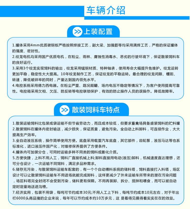 車(chē)輛參數(shù)配置:40方電動(dòng)散裝飼料運(yùn)輸車(chē),采用解放前四后六底盤(pán), 1900+4160+1350 軸距,錫柴 260/290 馬力,陜齒 9 檔變速箱,295 真空胎,電動(dòng)門(mén)窗中控鎖,電動(dòng)舉升,ABS,方向助力,上裝罐體容積約40立方,罐體采用4mm 鈦鋼板制作,罐體內(nèi)分為肆個(gè)倉(cāng),可獨(dú)立控制各分倉(cāng)卸料順序和速度,整車(chē)3條蛟龍(底部水平絞龍、尾部垂直絞龍、頂部卸料絞龍),由3個(gè)5.5kw 380v電機(jī)帶動(dòng)各絞龍工作,頂部絞龍液壓控制舉升,可左右旋轉(zhuǎn)180°,整車(chē)尺寸:11000*2550*3995,罐體尺寸:8000*2550*2500,液壓款散裝飼料運(yùn)輸車(chē),通過(guò)變速箱帶動(dòng)取力器取力后帶動(dòng)各絞龍工作,采用進(jìn)口液壓系統(tǒng),確保產(chǎn)品質(zhì)量,延長(zhǎng)使用壽命