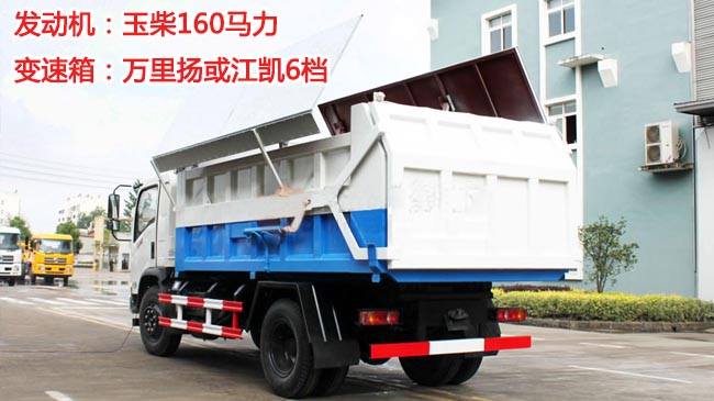 東風御虎對接式垃圾車,東風新款D12半排前翻駕駛室,2080mm寬,電動玻璃,玉柴160馬力發動機,萬里揚或江凱6檔變速箱,2.8噸前橋,8噸后橋,帶動力轉向,斷氣剎,ABS、下防護、232(7+4)大梁,軸距3.95米, 輪胎。