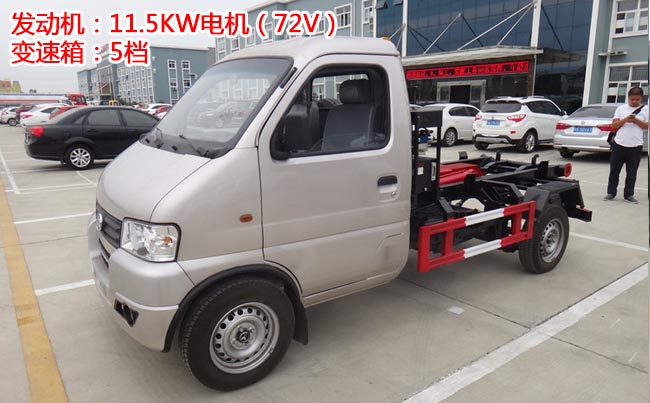 凱馬新能源勾臂垃圾車,轎卡1600寬車身,5檔變速箱,軸距2.9米,2.5噸后橋,165/70R14LT輪胎,獨懸大梁,11.5KW電機(72V),三元鋰電18.65度。