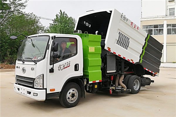 上裝配置:該車型在二類底盤上進行改裝,加裝副發動機、風機、清水箱、垃圾箱、掃刷、后置吸盤,掃盤降塵系統,液壓系統、專用裝置電控系統和副車架等改裝而成。