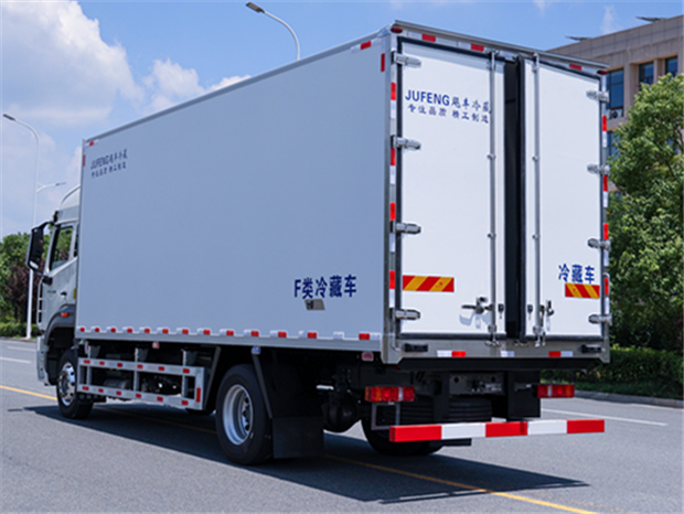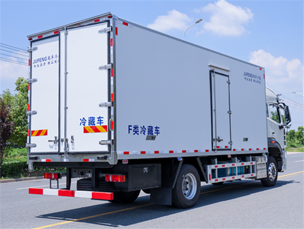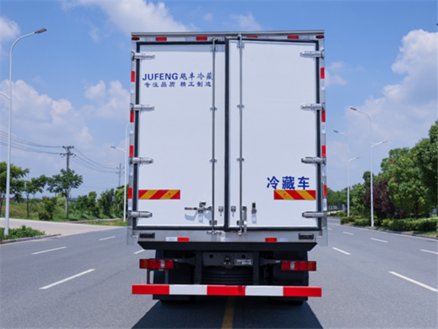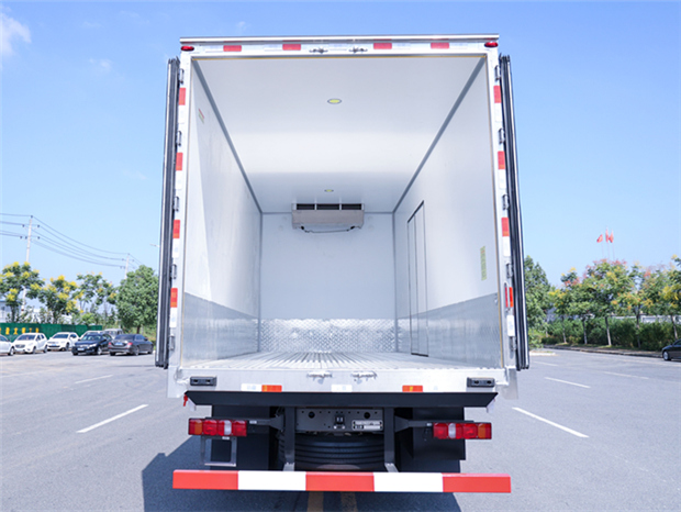 重汽豪沃6米8冷藏車廂體配置為:斷橋隔溫工藝,整體結構框架,內外面料為3mm新款啞光玻璃鋼夾保溫層真空復合而成,廂體厚度為8cm,最新款鋁合金包邊型材,型材局部厚度為4mm(鋼制鉚釘加固),廂體內部采用2個LED照明燈及廂體示寬燈,后門框不銹鋼材質,門框密封條為三元乙丙橡膠材質,加厚型不銹鋼合頁及鎖件;副梁為Q700車用大梁鋼,15mm厚大梁墊皮,加裝防撞膠塊,不銹鋼門鎖件,配后雙開門,副駕駛一側居中靠前開單側門一個,帶2個排水孔。